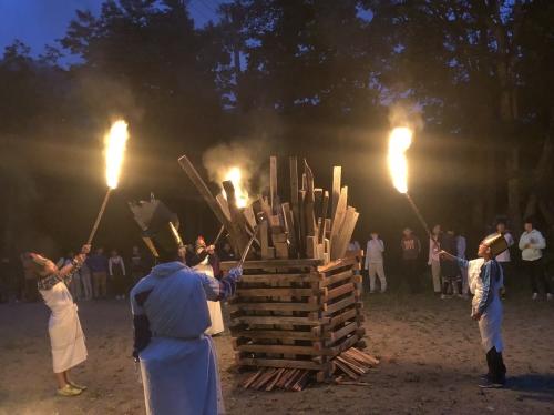 火の神と火の子によって、キャンプファイヤー点火です。