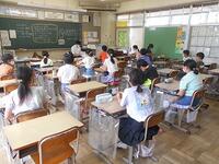 夏休みの課題を提出する子供達 手洗いもしっかりしています