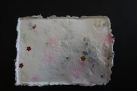 ペットボトルにちぎった牛乳パックと水とビー玉を入れ、よく振りながら細かくしました。それを使って、トレイで作った器具で和紙を漉きました。色々な材料を組み合わせて作りました。ベランダで乾かして完成です。