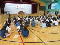 初めに開会行事を行い、五つのグループに分かれて自己紹介をした後、協力してゲームをしました。相談したり、多数決を撮ったりしながら、課題を解決していました。