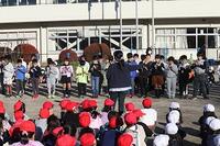 避難指示から全員が校庭に集まって人数確認が終わるまで、5分34秒でした。子供達は、防災頭巾をかぶり、黙って避難できました。避難時の約束『おかしもち』をしっかりと守って避難できました。