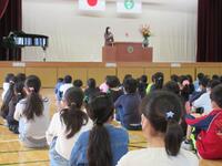 送る会の終わりに校長講話を観る児童