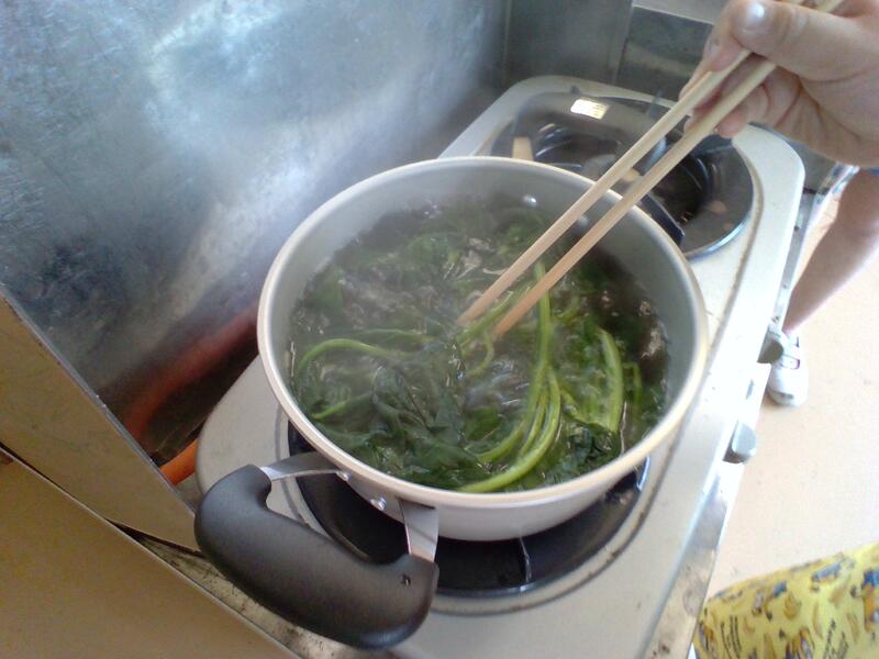 ほうれん草は流水で根元を中心によく洗い、たっぷりのお湯でゆでました。ゆで上がったら、水に取り、水気を絞ってから、包丁で切りました。