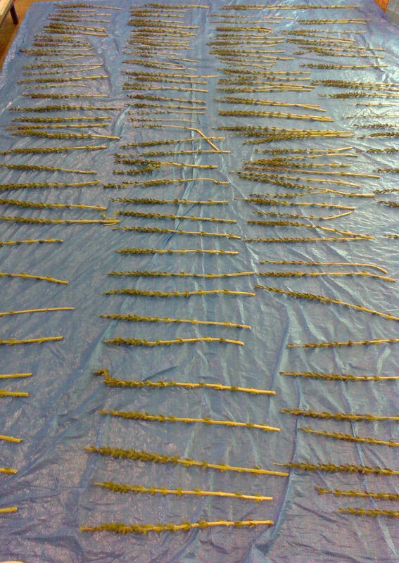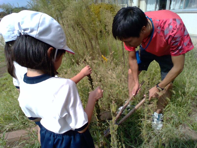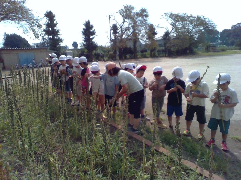 先週、2年生が金ごまの収穫をしました。6月に苗を植えてから、約3ヵ月が経ち、大きくすくすくと育った金ごまの茎には、さやがたくさん付きました。夏の太陽をたくさん浴びたさやは、濃い緑色になっていました。中には、成長が良く、さやから金ごまが弾けているものもありました。2種類の肥料を三層に施し、今年の金ごまの生育はとても良好でした。これから1ヵ月間、乾燥をさせてふるいにかけます。