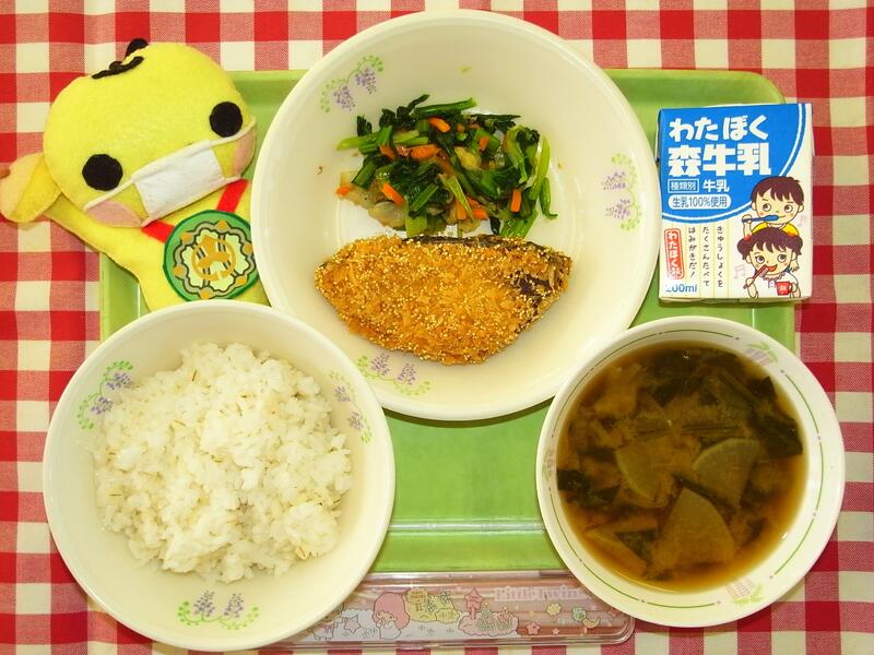 ・「ぶりの雑穀揚げ」は、国産農林水産物等販売促進緊急対策事業の活用により、鹿児島県漁連から無償提供された「養殖ぶり」を使用しています。本当は、レストランで使うはずだった食材を、捨てることなく上手に使おうというプロジェクトを利用して、鹿児島県の漁師さんが大切に育てたおいしい「ぶり」を給食に取り入れました。
