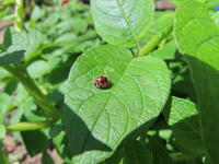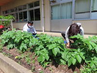 ひまわりがっきゅうえんでは、じゃがいもをうえています。どんどんおおきくなっているはっぱをみると、はっぱをたべるてんとうむしをなんびきもみつけました。つちをみるとみみずやだんごむしもいました。