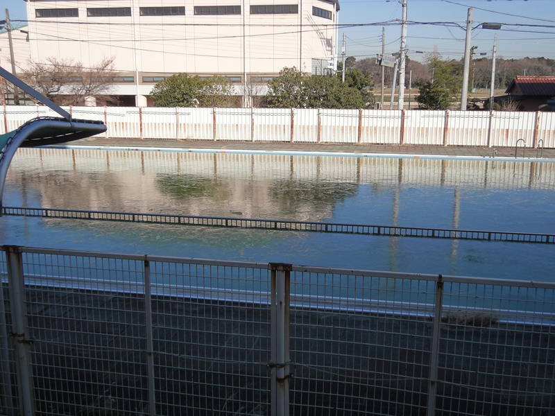 学校のプールや中庭の池が凍り付いています。