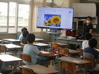 3年生は自分たちで育てたひまわりの花を取り入れた絵を描いています。ロウソクを使って絵の具をはじかせたり、花びらをクレヨンで描いたりする技法を使って仕上げています。どんな作品ができるか、とても楽しみです。