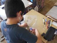 4年生は自分たちで育てたへちまを取り入れた絵を描いています。ステンシル版画という技法を使って、カラフルできれいなへちまを仕上げています。出来上がりがとても楽しみです。