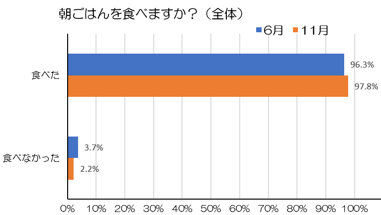 6月に第1回を実施した後、児童(給食委員会)の朝の「早寝早起き朝ごはん運動」の呼びかけ・学校長講和「朝ごはんの大切さ」を行い、11月に第2回を実施した。