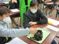 有名な産地である三陸沖で採れた「わかめ」の原藻を見て、大きさにも驚き、触って、匂いを嗅いで、初めての経験の児童がほとんどかと思います。