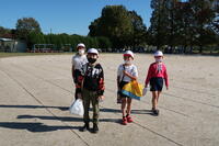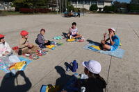 給食調理員さんが心を込めて作って下さったお弁当タイプの給食を、広い校庭を全面使ってレジャーシートを広げていただきました。
