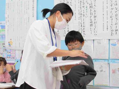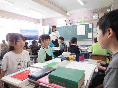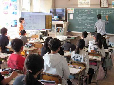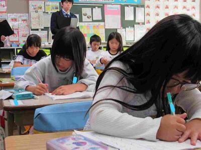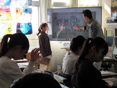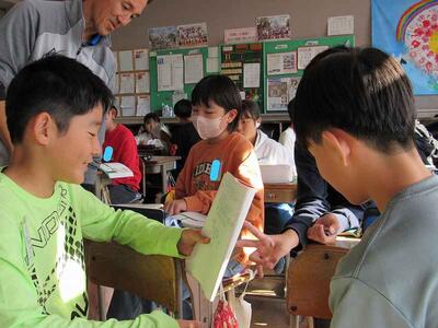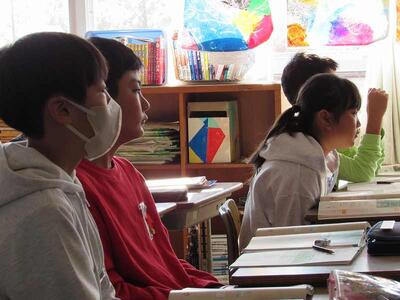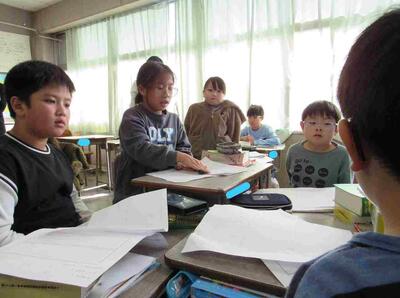 先生と一緒に、誠実さを自分ごととして考えている5年生たちです。