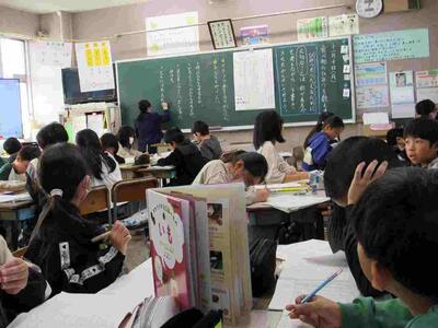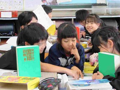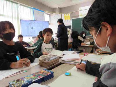 主人公の気持ちが葛藤する場面について、みんなで考え、話し合っています。
