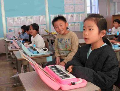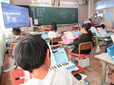 けん盤ハーモニカで、リズムをしっかりと取っています。
