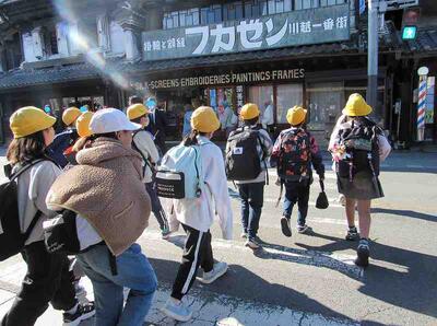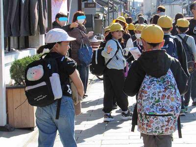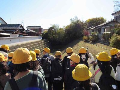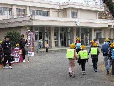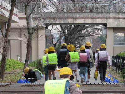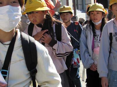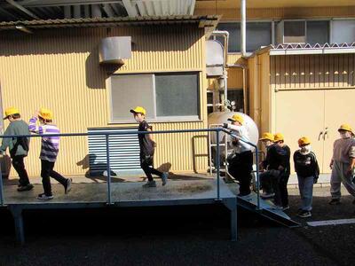 校舎の右方向からは、2年生たちが校庭へ避難です。