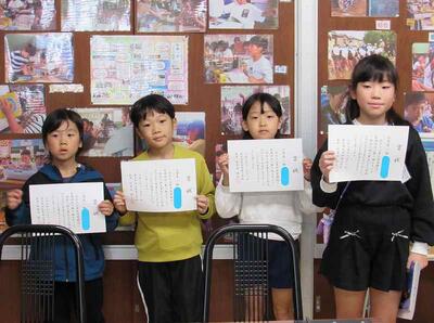 はじめに、マラソン100周達成者の5年生4人、4年生1人です。