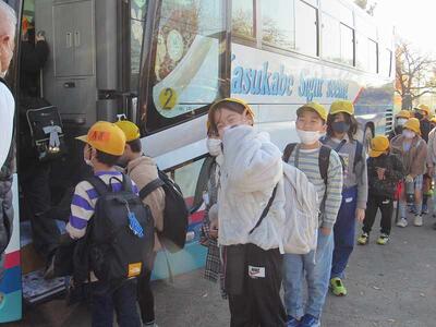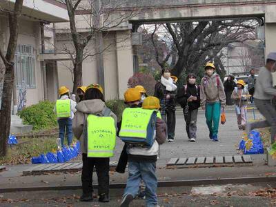 3、4階の西側に教室がある3年生、6年生が校庭へ。