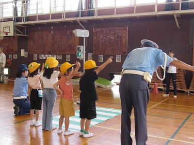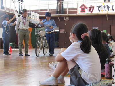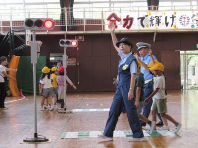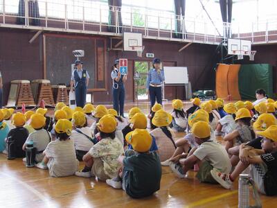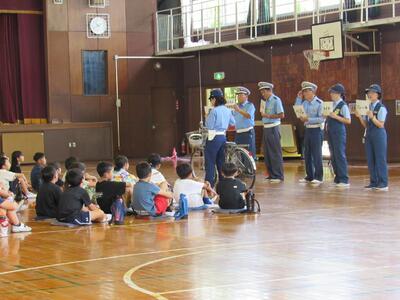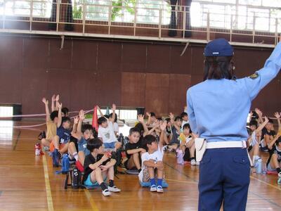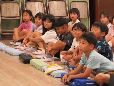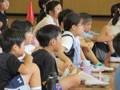 全校児童が体育館に集合し、代表選手たちにエールを送ります。
