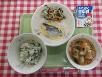このおいしいグリンピースを給食では「グリンピース入りわかめごはん」として、献立に取り入れました。