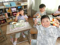 今年度も、コロナ感染対策のため異学年が交流する「バースデーランチ」でなく、各クラスでクラスのお友達に祝ってもらう「バースデーランチ」です。今日は、4月生まれの人のバースデーランチです。