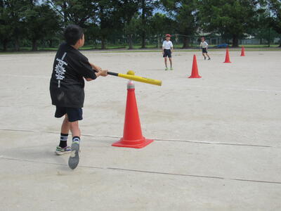 バットで、カラーコーンの上に置いたボールを打ちます。