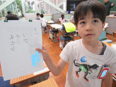 「校長先生、家で練習してきました。」 「ていねいな字でいいね。」