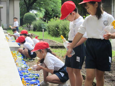 ◆ここ最近、1年生の朝の習慣は、朝顔の鉢植えに水やりです。