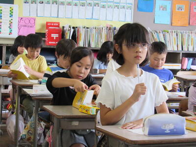 1年生の教室では、登校すると、ランドセルの中のものを机などにしまっています。