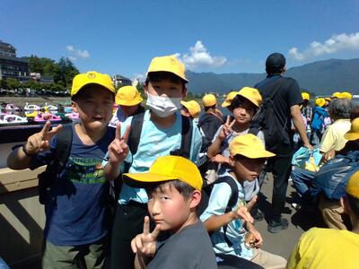ホテルを出発した後、河口湖で「遊覧船・天晴(あっぱれ)」に乗船しました。心地良い風に吹かれながら、景色を楽しみました。