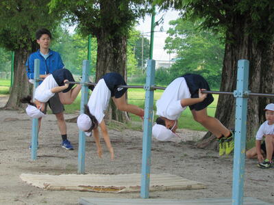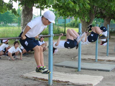 ◆4年生の体育では、大きな木の下で、鉄棒運動に取り組んでいますよ。