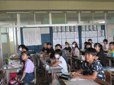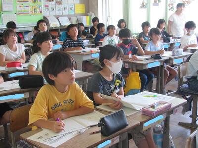 大画面の写真や絵、そして、講師の方のお話や実物を基に、しっかりとメモを取っていますね。