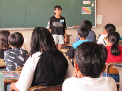 ここでは、2年生が、4年生の自主学習ノートの進め方を参考にしています。