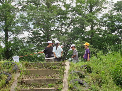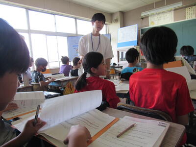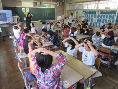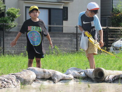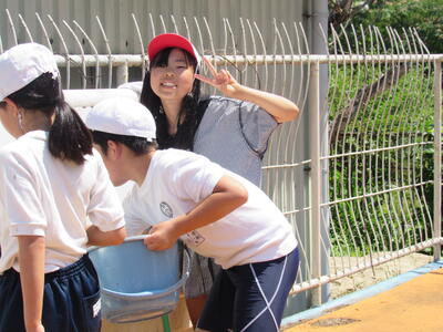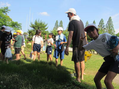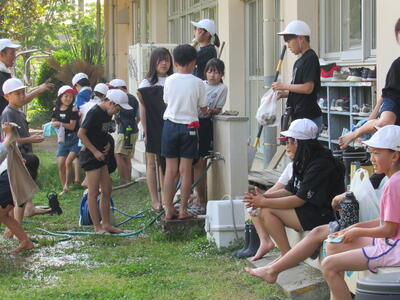 かなり気温が上がり、水分補給をしっかりとしながら学んでいる子供たち。