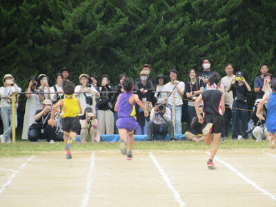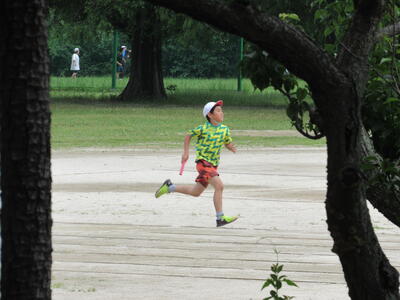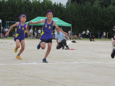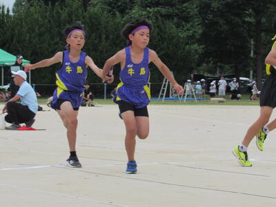 練習してきたバトンパスがきれいに決まって、前のランナーを追いかけます。