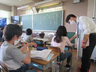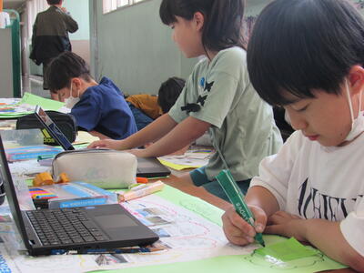 その後、これまでの学習の足跡(ワークシート)を活用し、今日の課題を解決しようとしています。