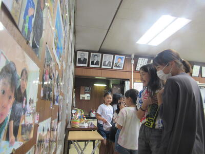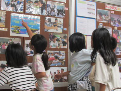 2~4年生、6年生が集まってきて、自分の学年・学級の写真を笑顔で見ています。