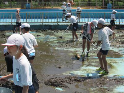 「プールが、泥でヌルヌルしています。」 「気を付けてね。」