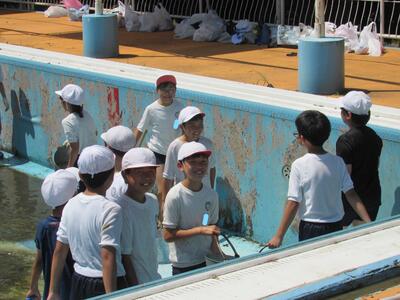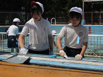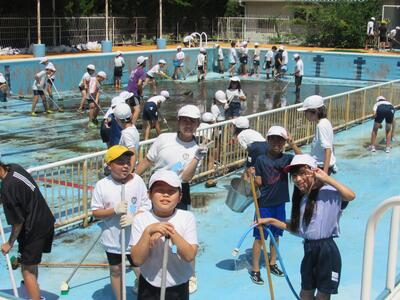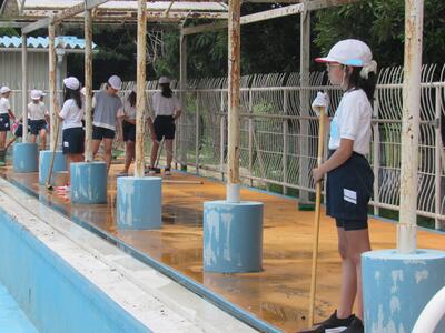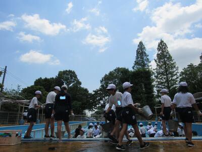 ◆1・2時間目、5年生がプール清掃に取り組んでいますよ。