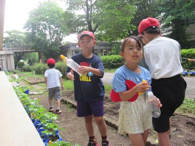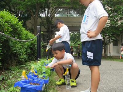 ◆1年生の朝のルーティーンと言えば、アサガオに水をたっぷりとです。