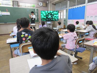 こちらの教室では、大画面に映し出された画像をよく見て考えていますよ。