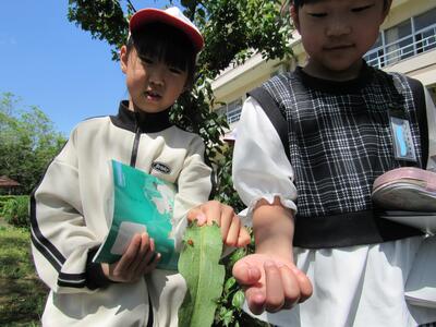「校長先生、てんとう虫です、見てください。」 「どの葉っぱにいたの?」