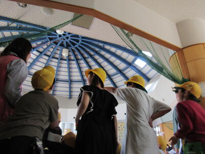 多目的に使えるドーム内の天井を見上げると、すずめが外へ出られなくなっています。