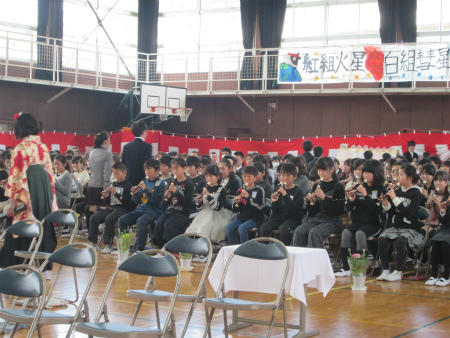 本日は、牛島小学校の第43回卒業証書授与式を体育館で行いました。小雨交じりの肌寒い朝でしたが、卒業生の門出を祝おうと、多くの方々が見えられました。定刻通りに開式した卒業証書授与式は、厳粛な雰囲気の中、進行していきました。呼びかけや歌も思いのこもった素晴らしい物でした。89名全員が参加し、中学校へと巣立っていきました。おめでとうございます。中学校でも頑張ってください。