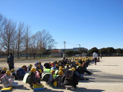 地区ごとの通学班で整列し、担当の先生からのお話をしっかりと聴きます。