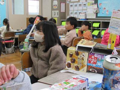 1年生の教室では、自分たちの作った作品を鑑賞し合おうとしていますよ。