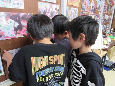 校長室へサインをしてほしいと来て、そのまま写真を見ている2年生たちです。