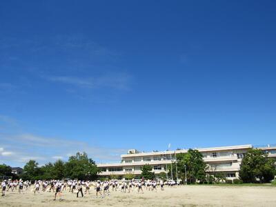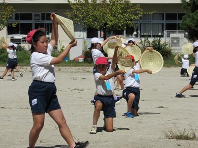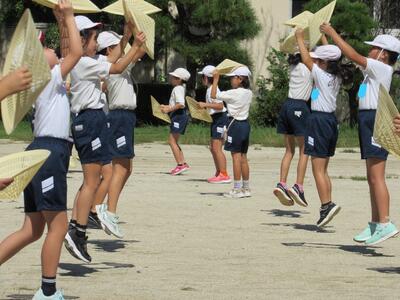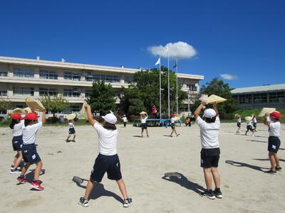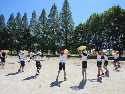 天気に恵まれる校庭に、3・4年生たちが出てきて、体を大きく使って表現しています。
