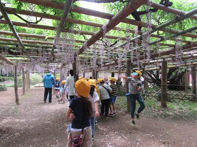 みんなで園内を散策し、藤の花の色や匂いを十分に観察していますよ。