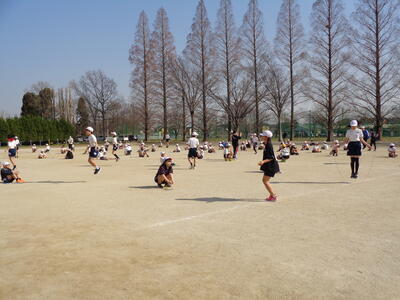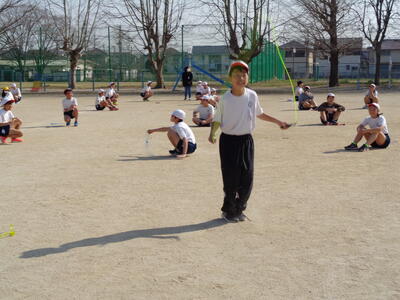 子供たちは、3分間跳びと二十跳びに挑戦しました。記録を少しでも更新しようとがんばっている姿が印象的でした。また、失敗して終わってしまった子が、まだ縄跳びを続けている子に「がんばれ」と声援を送っていて素敵でした。